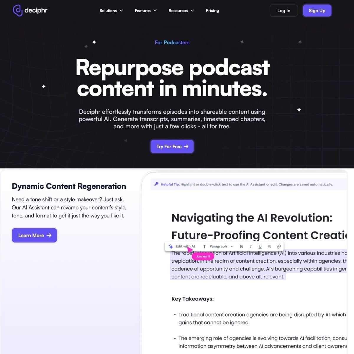 PodcastingDeciphr transforms podcast audio into shareable transcripts, summaries, and audiograms for easy online distribution.WebsiteWhat is Deciphr