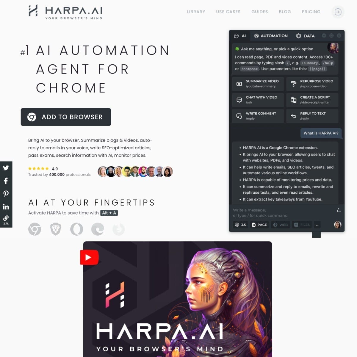 HARPA AI is a versatile browser extension tailored for professionals aiming to boost their productivity. It operates like a multi-functional tool, allowing users to manage emails, gather SEO insights, summarize YouTube content, and monitor prices—all through simple keyboard shortcuts. This integration transforms your browser into a centralized hub for various tasks, making it particularly beneficial for bloggers, online retailers, and anyone looking to streamline their workflow.