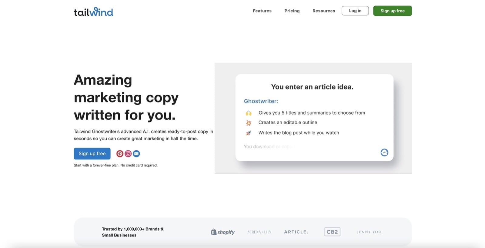 Social MediaTailwind App's Ghostwriter feature uses AI for quick SEO copywriting, ads, and social media posts to enhance your marketing.WebsiteWhat is Tailwind Ghostwriter